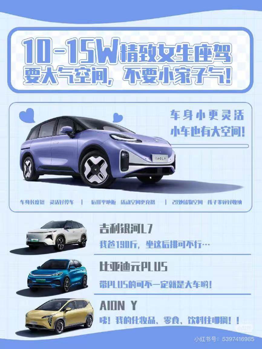 孩子爸给我推荐了几款,什么银河L7、元PLUS和AION Y,这些车我怎么觉得是给他自己挑的,没有一款是适合我的。