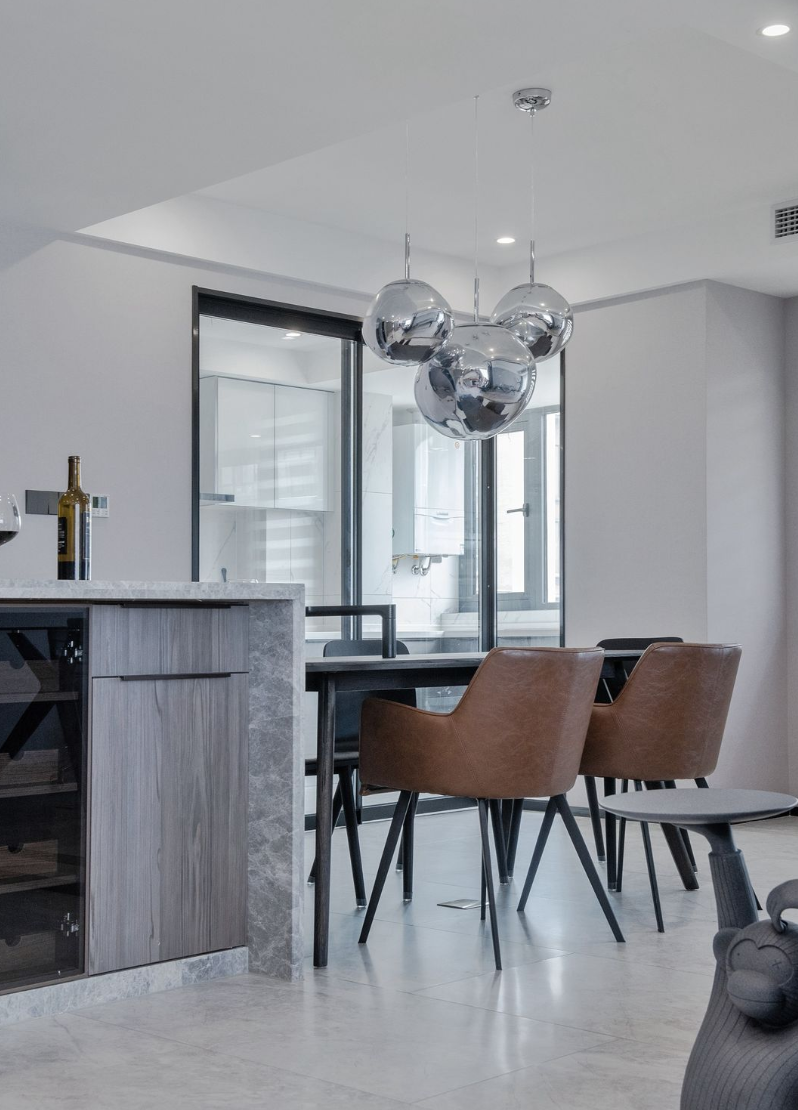 当餐厅划分出部分空间给厨房使用后,面积的确是小了很多,但正因为配置了吧台,功能性这块也完全没有受到一点影响。再加上整个餐厅也没有做多余的配置,以及给墙面刷上了灰色的乳胶漆,所以空间感还是很不错的。